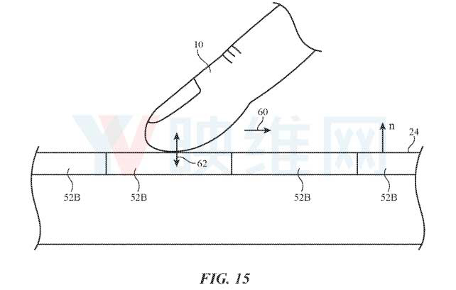 苹果进一步指出,根据手指朝输入表面的运动,电子设备的组件阵列可以对指戴设备和 / 或手指施加推力。所述组件可以利用静电,磁斥力或吸引力,超声波输出和机械输出来产生排斥力。作为示例,所述组件可以包括与输入表面重叠的电磁阵列,并对诸如永磁体这样的组件施加推力。