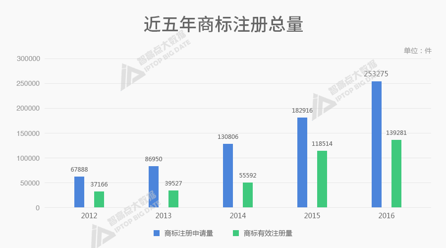 在2012年至2016年这短短的5年时间里,深圳商标注册申请数量从67888件飙升至253275件,整整翻了3倍多。而核准注册的商标数量亦呈直线上升状态,从12年的37166件上升至16年的139281件。近年来,深圳市商标注册申请量之所以能快速增长,主要原因之一是商事制度的改革有效激发了市场活力和发展力,使得新登记企业量大幅增长,创业势头迅猛使得商标事业也随之蓬勃发展。据深圳市政府报告,截至2016年底,全市工商登记注册的中小企业149.8万家,占企业总数的99.6%,新登记企业中,80%以上属于现代服务业,创业资源集聚在以现代服务业为主的第三产业。同时,得益于市场监管部门的指导、宣传和培训,公众的商标品牌意识大大增强。商标数量的显著增长说明商品的生产者、经营者及服务的提供者数量有所上升,体现出深圳近5年内商品市场的繁荣景象,侧面反映了深圳近5年内极其活跃的创业氛围。