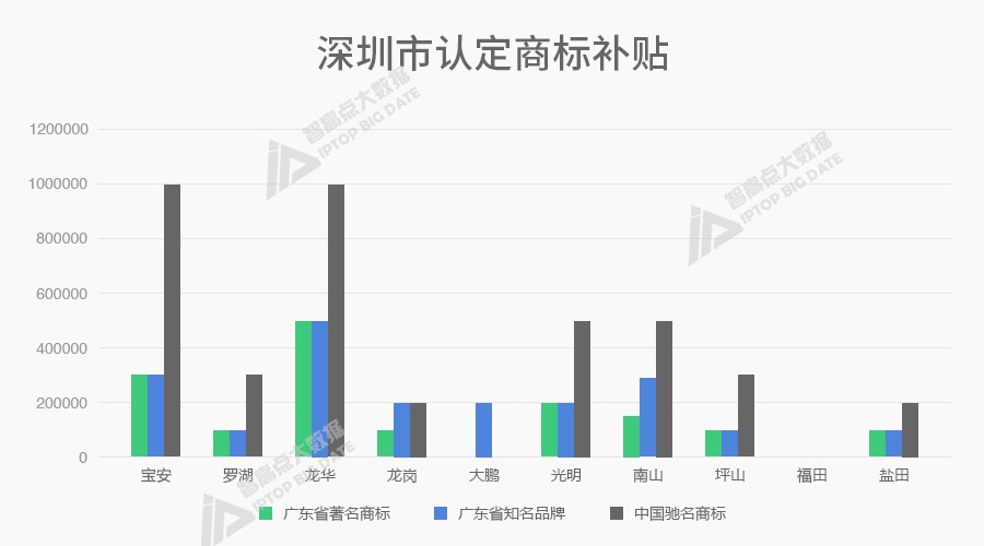 截至2016年12月,我市累计拥有中国驰名商标166件。截止2016年12月,深圳市累计拥有的广东省著名商标506件。深圳各区为鼓励商标发展成品牌,针对驰著名商标出台了完善的补贴政策。立足长远,重视地区经济的发展及品牌的建设。政府部门对商标品牌的补助政策,也能极大的促进地区著名、驰名商标的不断壮大发展。品牌是企业的无形资产,随着企业品牌的创建和推广,其价值不断提高并为企业带来更大的经济效益,从而为深圳GDP总值作出更大的贡献,形成良性循环。